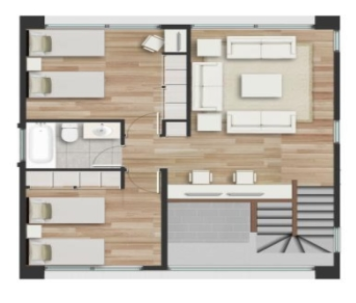 Piso de madera 8mm en living comedor, sala de estar y dormitorios en primero y segundo piso.
